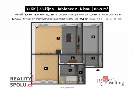 Výhradně nabízíme k prodeji velmi pěkný zmodernizovaný byt o dispozici 3+kk. Byt o velikosti 86,9m je situovaný v centru města Jablonec nad Nisou - ulice 28. října. Tato lokalita poskytuje rychlou dostupnost centra města, přírodu a veškerou občanskou vybavenost . Bytová jednotka se nachází ve 4. podlaží historické budovy a díky celkovému počtu 4 bytových jednotek (opravy dokončeny v r. 2024 ) přináší vysoký nadstandard a soukromí, navíc v centru města. Dokončené opravy: - elektřina, topná soustava, vodoinstalace, renovace podlah, zdiva - nová kuchyně s novými spotřebiči - nová koupelna Rozmístění pokojů: - předsíň - pokoj - chodba - WC - koupelna s vanou a sprchovým koutem - pokoj - obývací pokoj s kuchyňským koutem K bytu náleží navíc venkovní prostor který lze využit jako balkón nebo vnitřní terasa a sklepní prostor o velikosti 15,4m, který lze využít jako komerční prostor. Vytápění v této nemovitosti je pomocí plynového kotle s radiátory. Velmi rádi Vám nemovitost představíme, seznámíme Vás s možnostmi financování a samotným převodem nemovitosti do Vašeho vlastnictví. Náklady Realitní kanceláře, právní služby, bankovní úschova i samotný poplatek za převod vlastnictví jsou již zahrnuty v celkové Kupní ceně. Těšíme se na prohlídku. <a href="https://www.eurobydleni.cz/domy/rodinny-dum/vsetin/obec-roznov-pod-radhostem/prodej/"><strong>Prodej rodinného domu Rožnov pod Radhoštěm</strong></a>