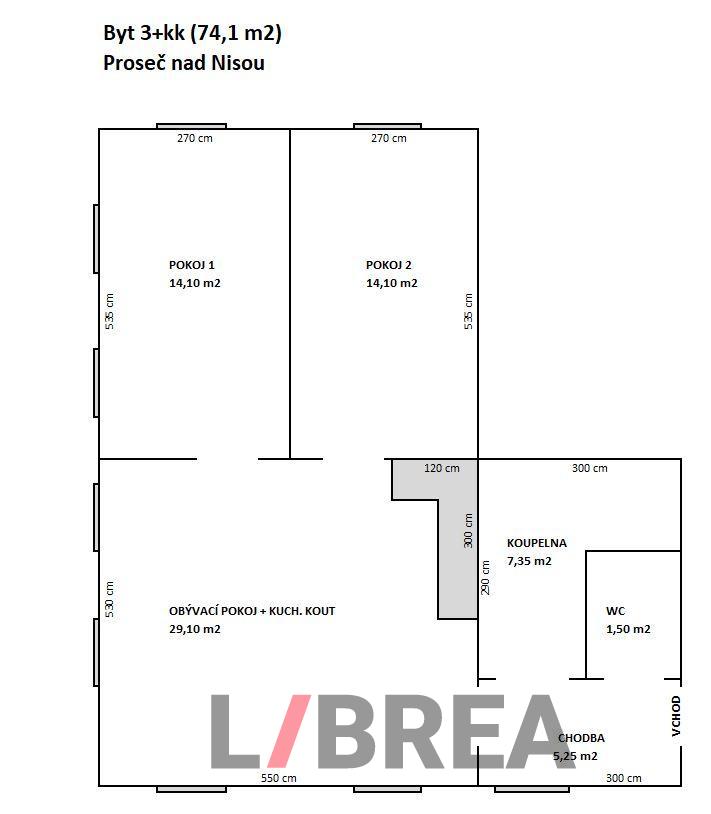Výhradně Vám nabízíme ke koupi prostorný byt 3+kk o velikosti 71,4 m2 v samostatném bytovém domě se zahradou v Proseči nad Nisou. Tento byt v osobním vlastníctví je umístěn na 3. podlaží s výhledem do zeleně. Dispozice bytu: vstupní chodba s přístupem do koupelny a samostatné WC, obývací pokoj s kuchyňským koutem, ložnice a dětský pokoj. Výměry jednotlivých místností jsou v přiloženém půdorysu. Kuchyňská linka je v rustikálním stylu, její součástí je elektrická trouba, indukční deska a mikrovlnná trouba. K bytu patří prostorná sklepní kóje. V domě je také společná kolárna/kočárkárna. Velkou výhodou tohoto bytu je možnost využívání společné zahrady s pergolou, ohništěm a dětským hřištěm. Dům se nachází v dochozí vzdálenosti k tramvajové zastávce s možností rychlého spojení do centra Liberce či Jablonce nad Nisou. Zároveň je možné se do 10 minut dostat autem na dálnici směrem na Prahu. Byt bude volný k nastěhování dle dohody. V případě zájmu o prohlídku kontaktujte prosím našeho realitního makléře.